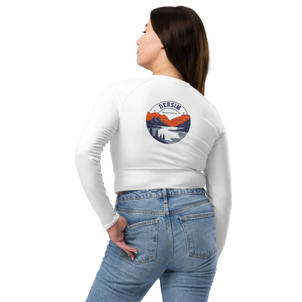 Dieses recycelte Langarm Crop Top mit Allover-Druck besteht aus recyceltem Polyester und Elastan. Dadurch wird es zu einer umweltfreundlichen Wahl für Bade-, Sport- oder Athleisure-Kleidung. Das Crop-Top hat ein abreißbares Pflegeetikett und einen breiten, doppellagigen Bund für eine bequeme Passform.